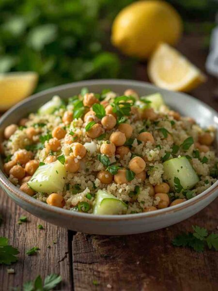 Quinoa Salad with Chickpeas, Cucumbers, and Lemon Dressing