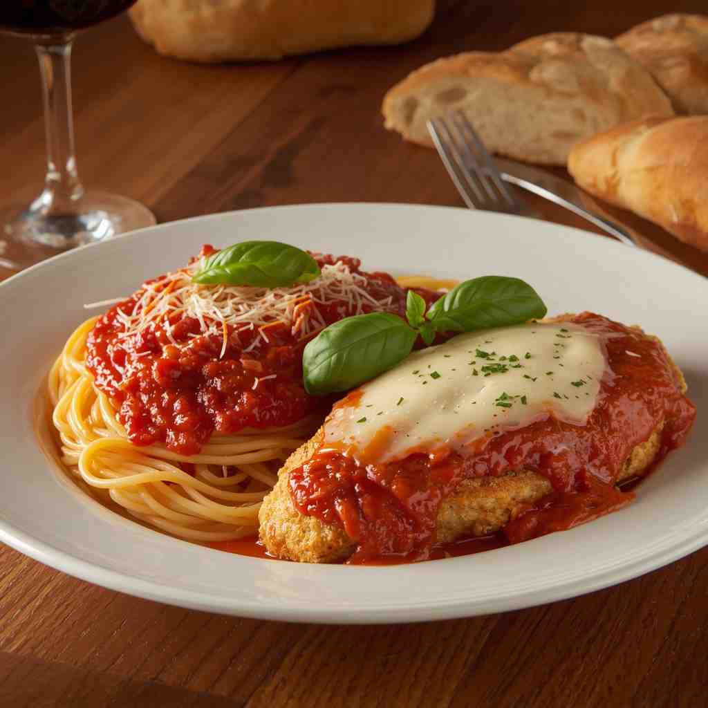 Chicken Parmesan with Spaghetti is a classic Italian-American comfort dish that combines crispy breaded chicken, rich marinara sauce, and gooey melted cheese served over a bed of al dente spaghetti.
