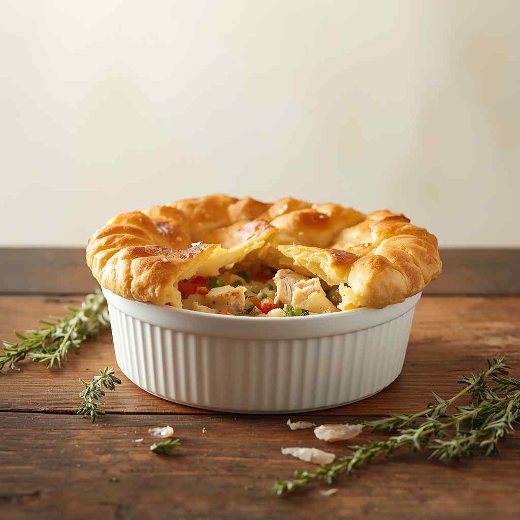 3. Step 3: Bake the Pot Pie :Place the dish on a baking tray (to catch any drips). Bake for 30–35 minutes, or until the crust is puffed and golden brown. Let it cool for 5–10 minutes before serving — the filling will thicken slightly as it cools.