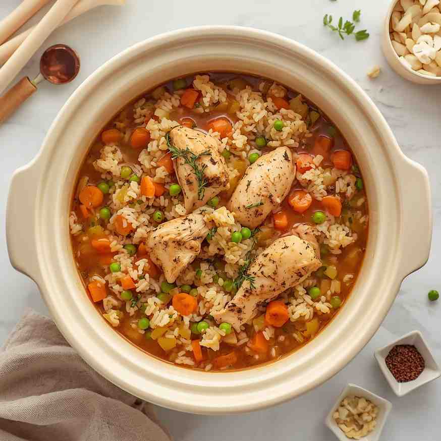 I adore this crockpot recipe because it combines ease, nutrition, and flavor in one dish. The chicken becomes tender and juicy as it slowly simmers with the rice and vegetables, while the natural flavors of the veggies enhance the broth. Every spoonful is a balanced combination of protein, carbs, and vegetables, making it a complete meal in itself. I also love that it’s customizable—you can swap vegetables, adjust seasonings, or even use different types of rice to suit your family’s taste. It’s comforting, hearty, and a lifesaver on busy days.