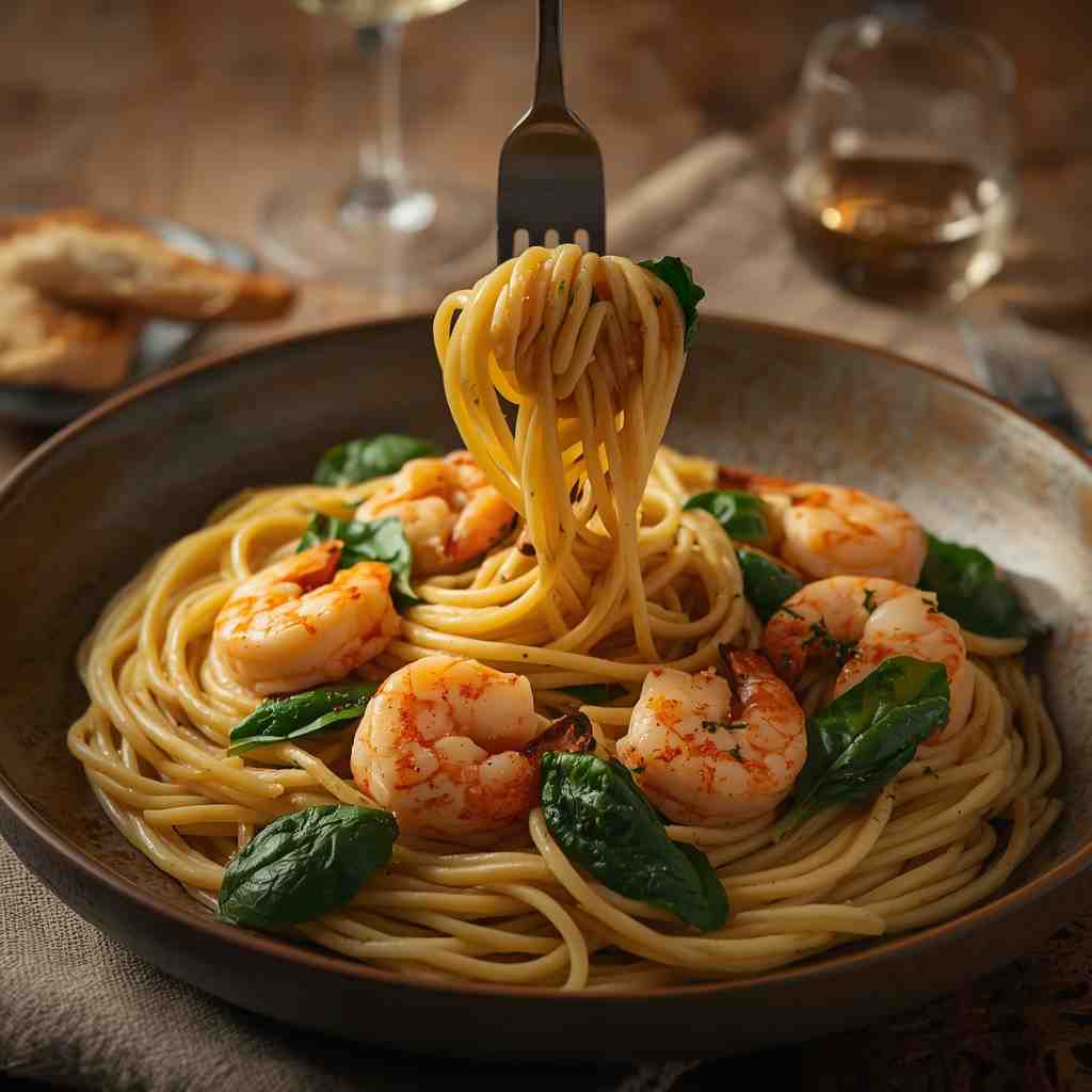 The dish features tender shrimp sautéed in garlic butter and tossed with perfectly cooked pasta and fresh spinach, all enveloped in a light, flavorful sauce made from butter, garlic, and a touch of lemon. The combination is luxurious without being heavy — a perfect example of how simplicity can produce outstanding results.