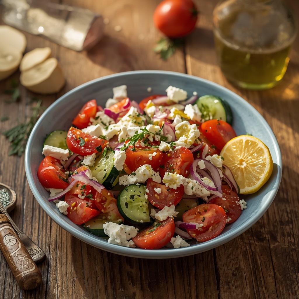 Greek Salad, or Horiatiki, is one of the most iconic Mediterranean dishes that embodies freshness, balance, and simplicity. This Greek Salad with Feta and Lemon-Oregano Vinaigrette captures the vibrant flavors of the Mediterranean coast with crisp cucumbers, juicy tomatoes, sharp red onion, briny Kalamata olives, and creamy feta cheese, all tied together with a zesty lemon-oregano vinaigrette.